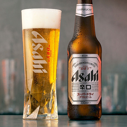 Asahi Super Dry Lager is a distinguished beer produced by Asahi Breweries, a leading brewing company based in Tokyo, Japan. Known for its iconic crisp, clear taste and quick clean finish, it embodies the company's philosophy of innovation and aptly represents Japanese expertise in brewing.
